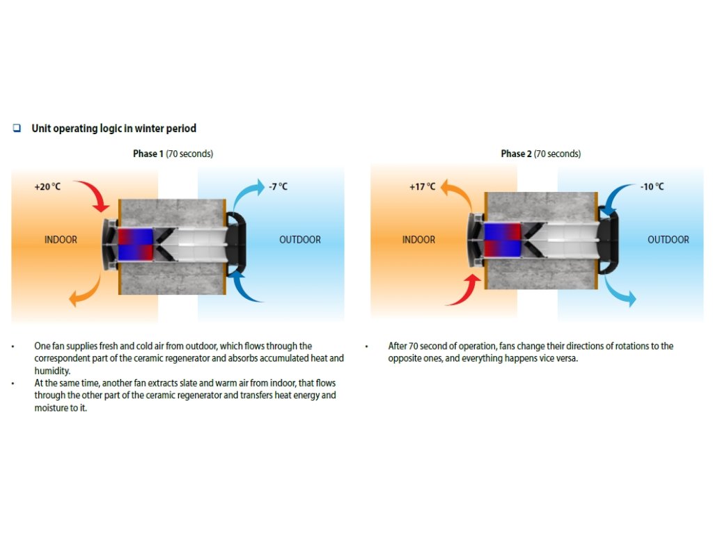 - Teplý a vydýchaný vzduch je odváděn ven z prostor přes tepelný výměník. Při průchodu tepelný výměník využije až 91 % tepelné energie. Proces režimu odtahu vzduchu trvá přibližně 30 až 120 sekund a je možné jej individuálně nastavit v průběhu instalace. Jakmile čas odtahu vzduchu doběhne, ventilátor přepne do režimu přívodu. Chladný přivádění, venkovní vzduch prochází jednotkou, kde je ohříván teplem nahromaděným ve výměníku tepla. Když se výměník tepla ochladí, ventilátor přejde do režimu odtahu a proces se opakuje.